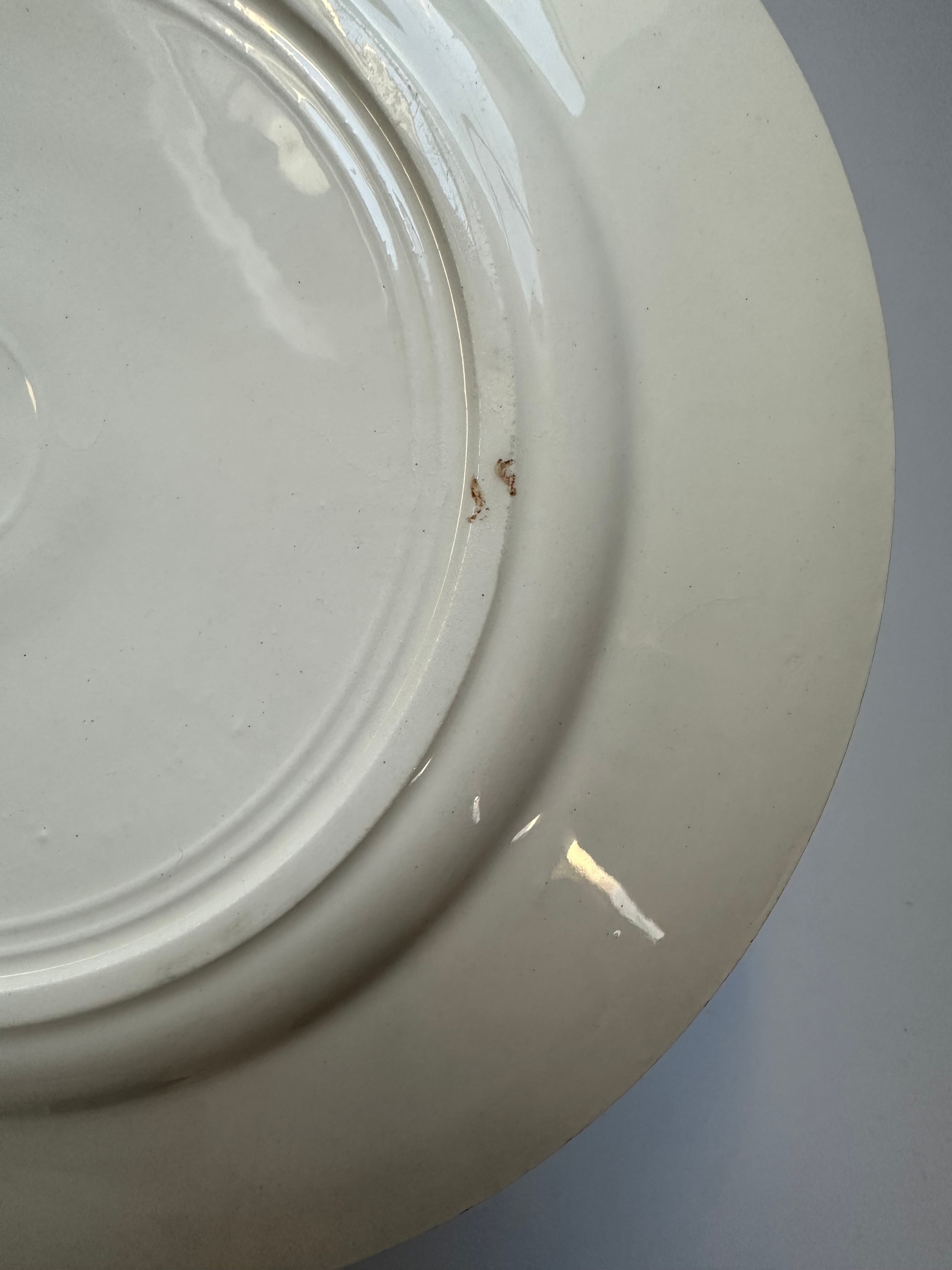 貫入は見当たりません。カトラリー傷、窯傷、スレ、小さな傷、裏に制作中の支柱跡、シミ、色ムラ、色飛びございます。