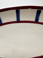 貫入、カトラリー傷、窯傷、スレ、小さな傷、裏に制作中の支柱跡、シミ、色ムラ、色飛びございます。
