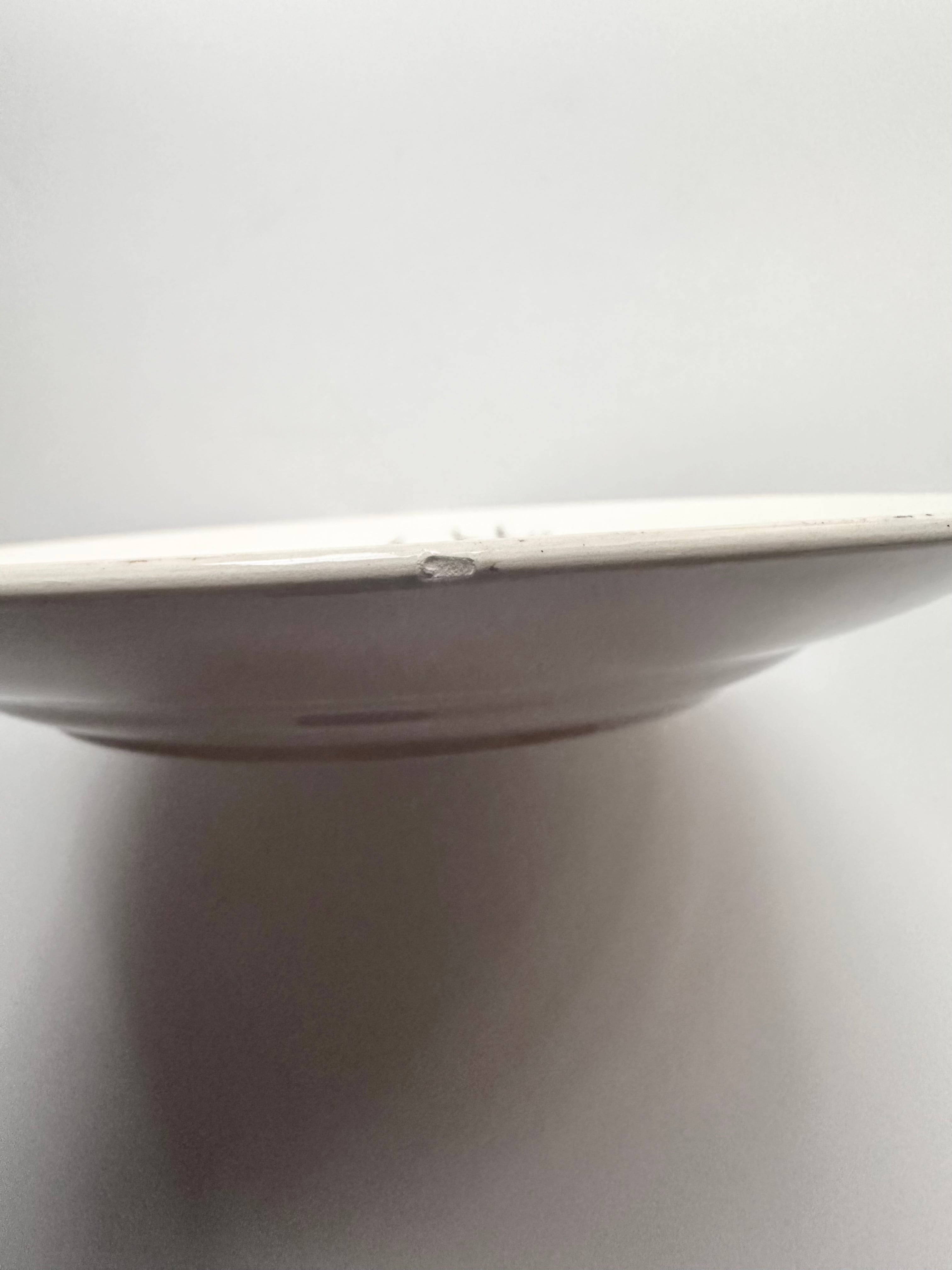 貫入は見当たりませんが、カトラリー傷があります。その他、窯傷、スレ、縁に小さな傷、裏に制作中の支柱跡、シミ、色ムラ、色飛びございます。