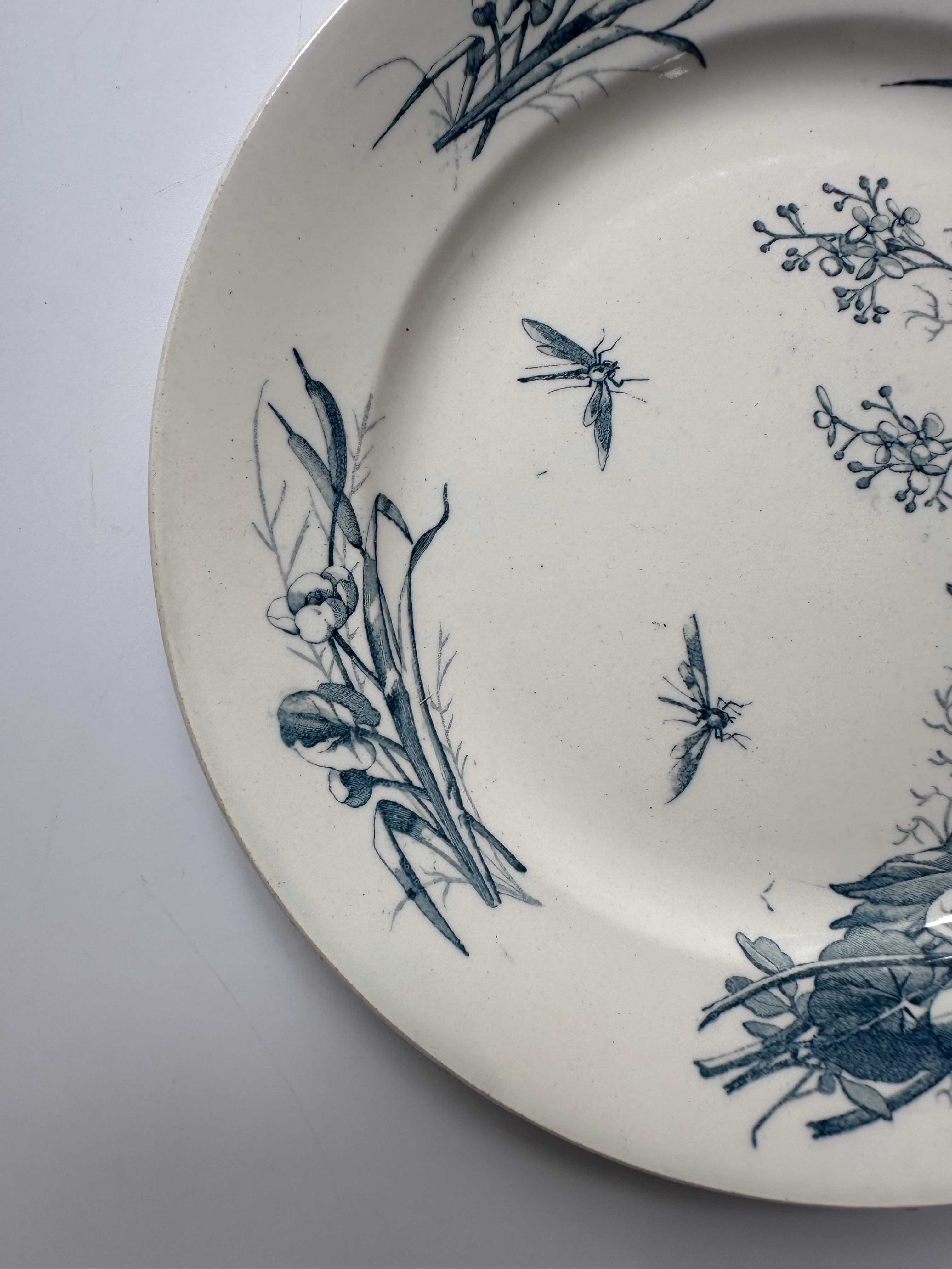 紺色で菖蒲と虫たちが描かれた美しいお皿です。