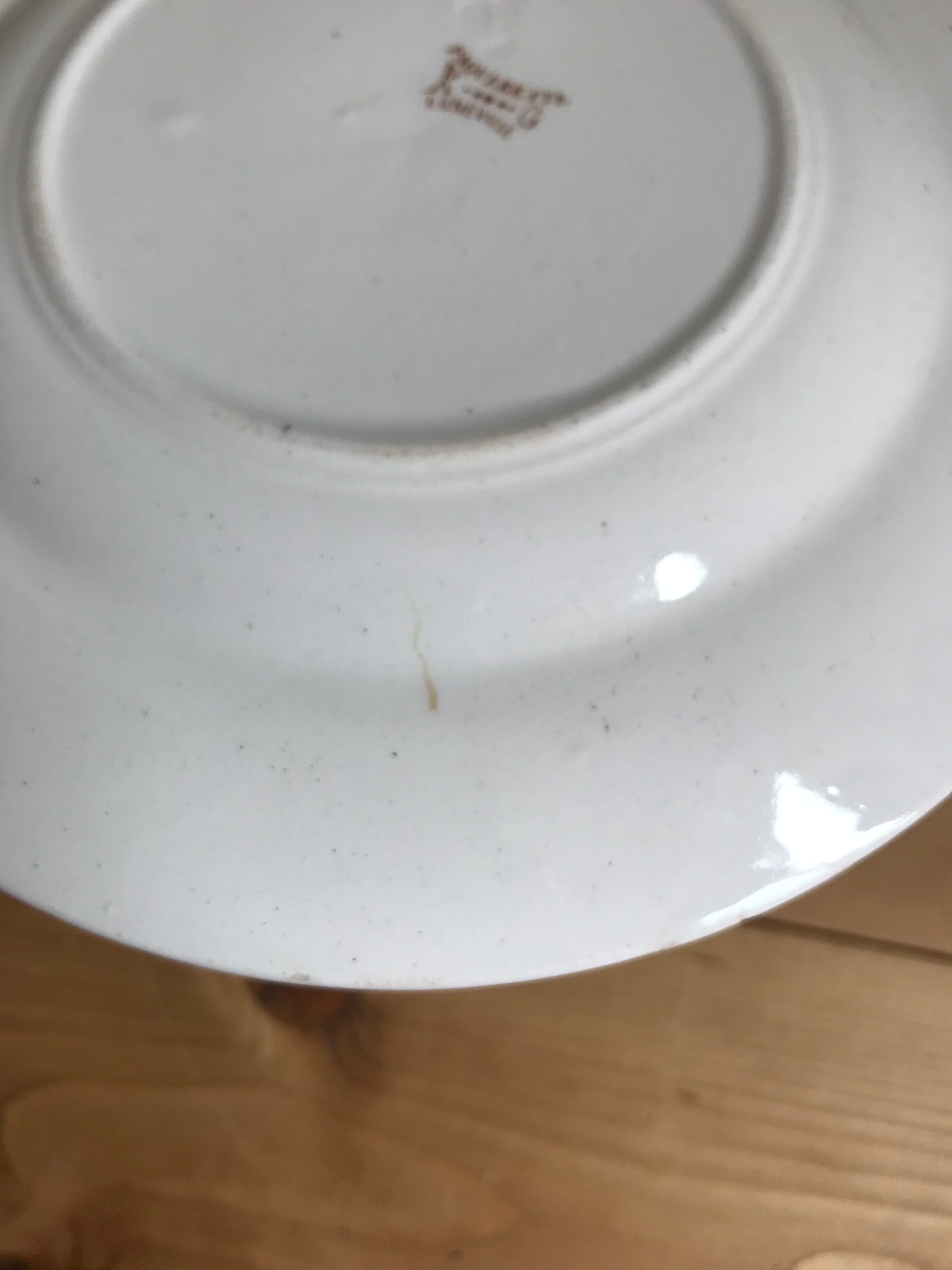 貫入は見当たりません。カトラリー傷、窯傷、スレ、小さな傷、裏に制作中の支柱跡、シミ、色ムラ、色飛びございます。