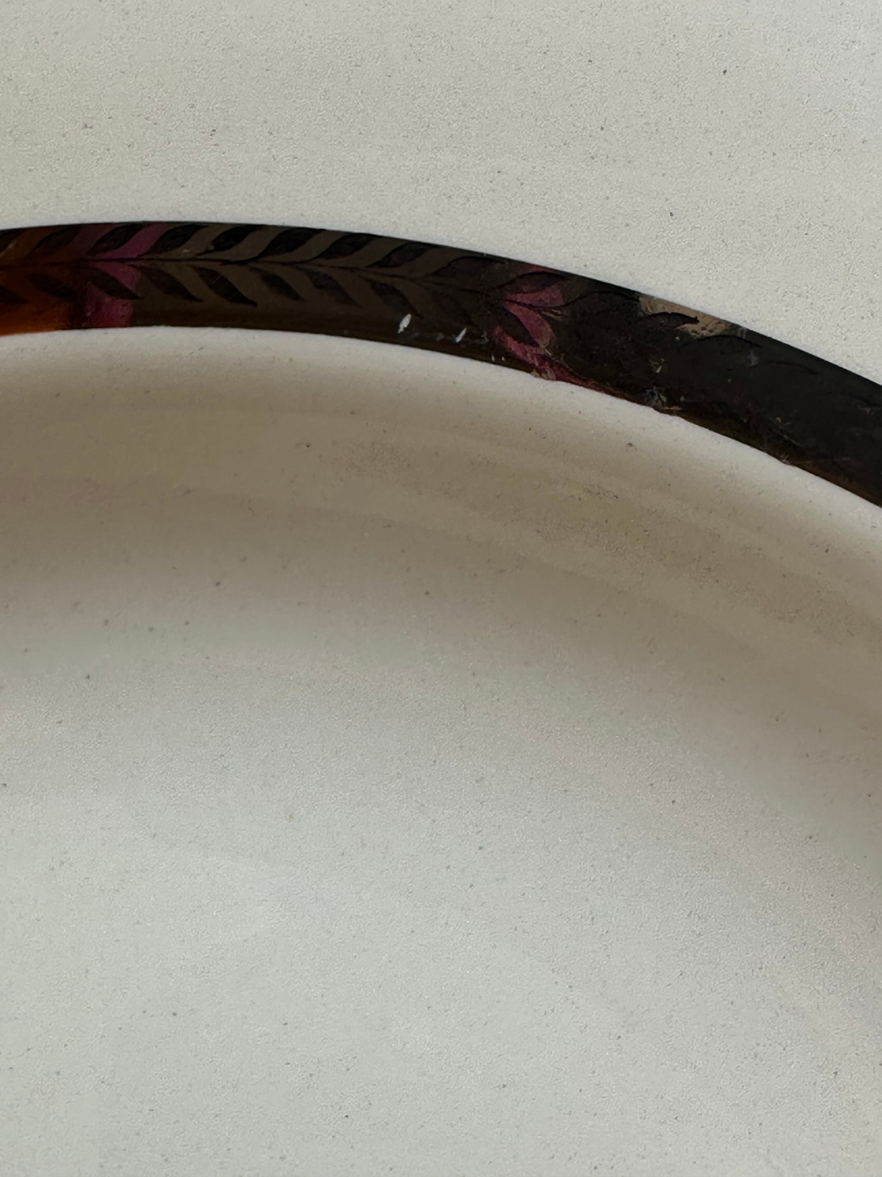 貫入は見当たりません。カトラリー傷、窯傷、スレ、小さな傷、裏に制作中の支柱跡、シミ、色ムラ、色飛びございます。