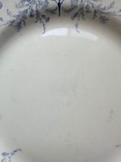 貫入は見当たりませんが、擦れが中央にございます。カトラリー傷、窯傷、小さな傷、裏に制作中の支柱跡、シミ、色ムラ、色飛びございます。
