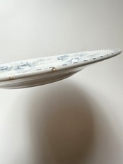 縁に小さなチップがありますが、表面には影響はなく、魅力を損ねるダメージではありません。カトラリー傷、窯傷、スレ、小さな傷、裏に制作中の支柱跡、シミ、色ムラ、色飛びございます。